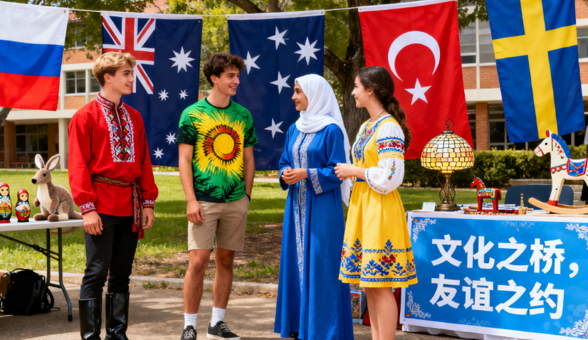 文化节现场设置了38个国家文化展位,每个展位由对应国家的留学生负责布置,展示本国的传统服饰、手工艺品、历史照片和特色美食。中国留学生展位的剪纸艺术、书法表演和饺子制作体验吸引了大量师生驻足;日本留学生带来的茶道表演和寿司制作让大家感受日式美学;肯尼亚留学生的传统舞蹈和手鼓表演则展现了非洲大陆的活力与激情。此外,文化节还举办了国际学术论坛,来自不同国家的学生围绕“跨文化交流与全球公民意识培养”展开深入探讨。