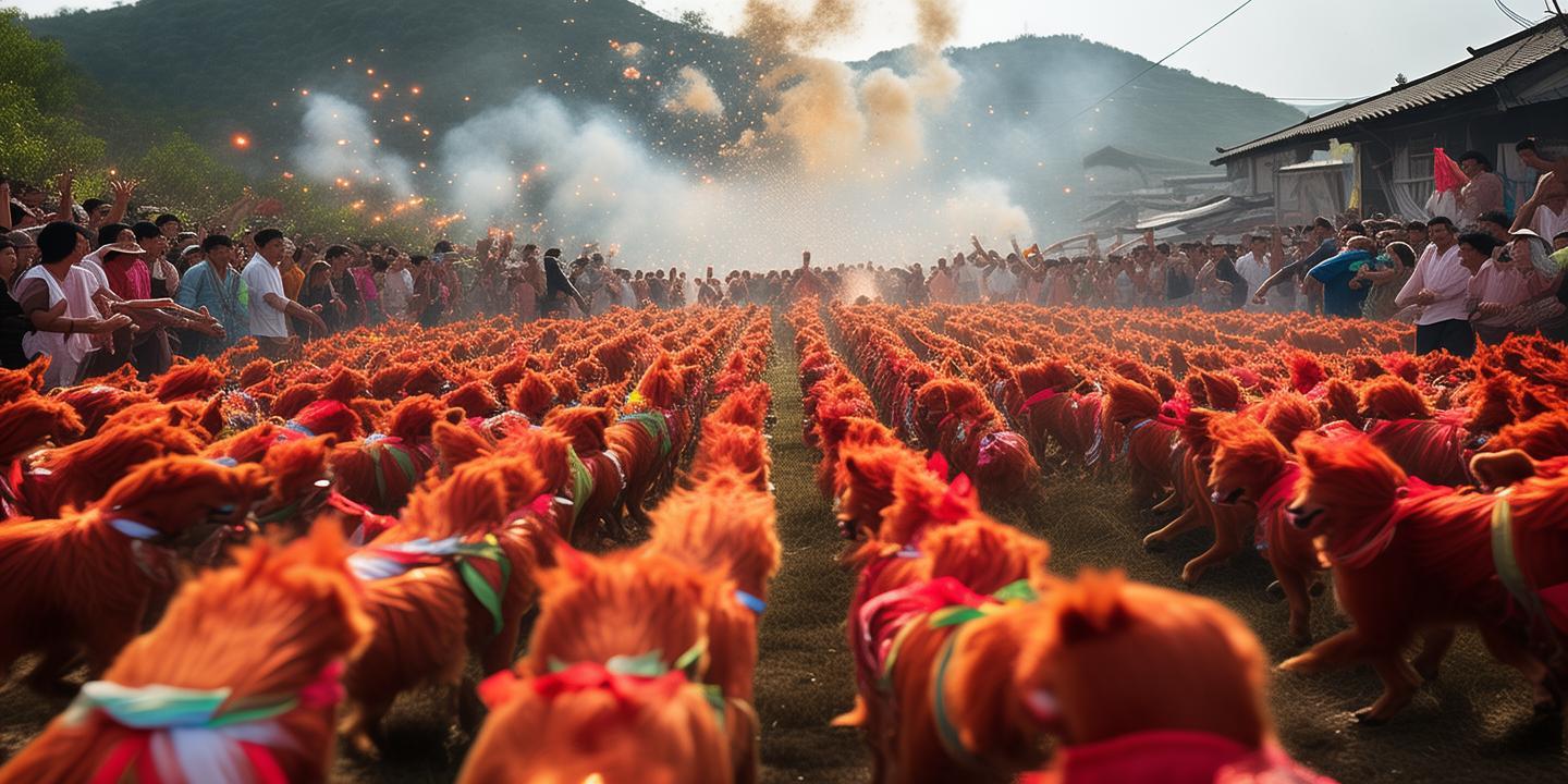 在节日的早晨,村民们身着节日盛装,齐聚村口。随着一声令下,百只经过精心装饰的火狗开始狂奔。这些火狗是用稻草、麻绳等材料 *** 而成,头部装饰有红色丝绸和五颜六色的花朵,象征着吉祥和幸福。
