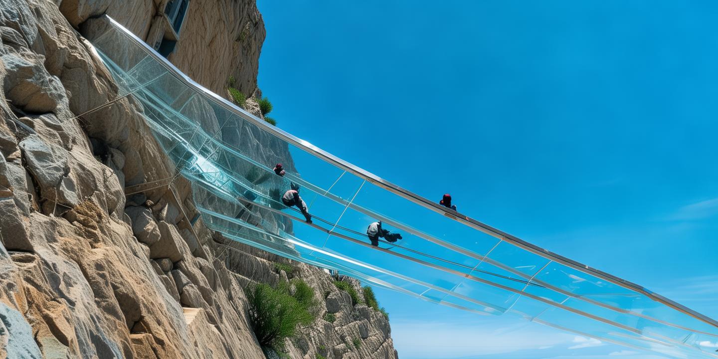 玻璃滑道全长约200米,位于悬崖栈道更高处,与地面垂直高度达50米。游客在体验玻璃滑道时,需要穿上特制的防护装备,然后沿着滑道从高处飞驰而下。整个过程仅需5分钟,仿佛瞬间穿越云端,让人感受到“空中飞人”的 *** 与 *** 。
